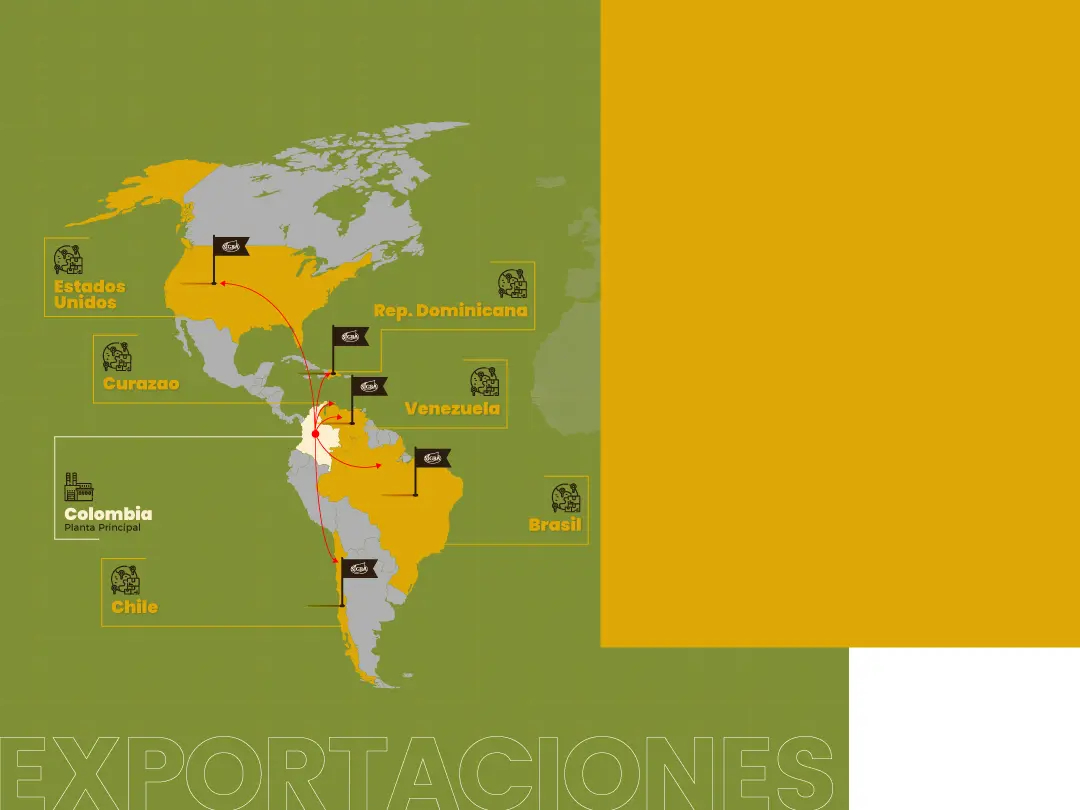 Con más de 68 años de trayectoria en el mercado colombiano, nuestros productos se abren camino por el mundo gracias a su excelente calidad y el equipo de trabajo que respalda cada uno de nuestros envíos internacionales. Llevamos más de 15 años exportando lo mejor de nuestras margarinas, contribuyendo al desarrollo del sector de la panadería y la pastelería en varios países, poniendo a disposición toda nuestra experiencia para entregar productos de la más alta calidad a los consumidores finales. Somos tradición colombiana que cruza fronteras.